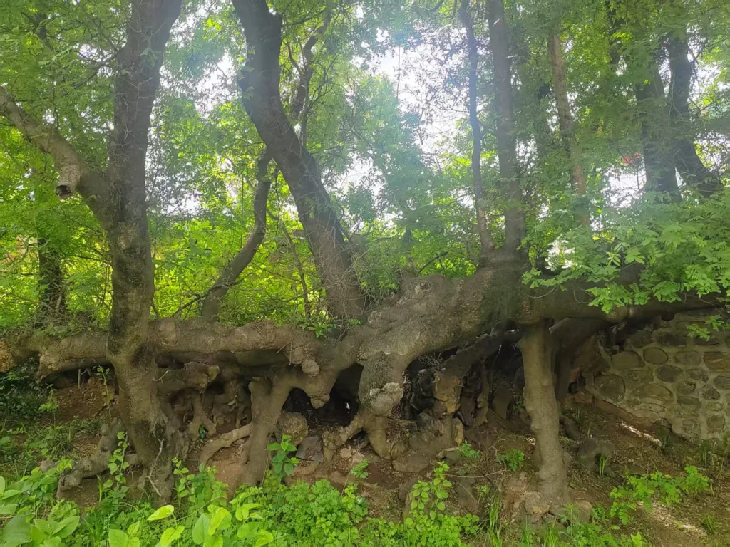 虬枝盘绕,繁英争闹,孤躯独覆千层罩。傲风涛,聚蜂潮,新丛郁郁根相抱,一脉连柯春不老。奇,天地渺;绝,尘界少。